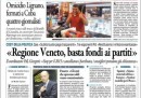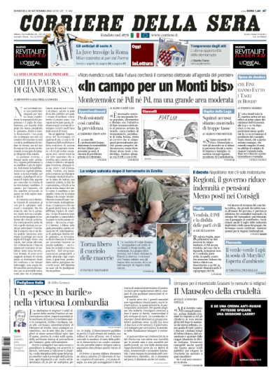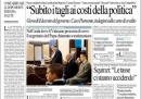 Le aperture dei maggiori quotidiani nazionali di oggi sono abbastanza varie. Il Corriere della Sera attacca con un’intervista a Luca Cordero di Montezemolo, presidente di Italia Futura, che dice di voler sostenere una prossima candidatura di Mario Monti. La Repubblica, invece, apre parlando del decreto del governo sui tagli ai costi della politica, la cui approvazione è prevista per giovedì. L’Unità titola chiedendo una legge anti-corruzione al più presto, mentre la Padania e Libero parlano di quel che è stato detto ieri a Torino da Maroni.