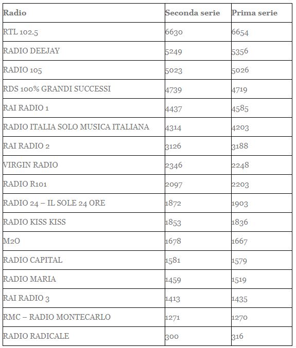 La classifica completa delle prime 17 radio nazionali e il confronto tra la prima e la seconda serie di rilevazioni (in migliaia).