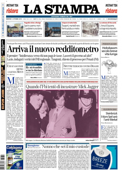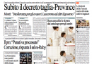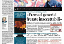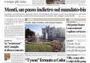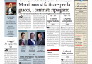 I giornali di oggi hanno notizie diverse in apertura: il Corriere della Sera, il Tempo e il Messaggero seguono l’inchiesta sul PDL del Lazio, che vede nuovi sviluppi che coinvolgerebbero i vertici regionali del partito, Avvenire, il Mattino e Europa si occupano delle parole di Monti, che sembra escludere di voler rimanere al governo anche dopo le elezioni, la Stampa presenta il nuovo redditometro, in arrivo per la fine del mese, Repubblica apre con il decreto per il taglio delle province, il Giornale e Libero si dedicano alla richiesta dei pm di processare Penati, e Pubblico e il Manifesto seguono la campagna per le primarie del PD.