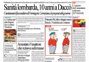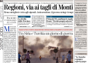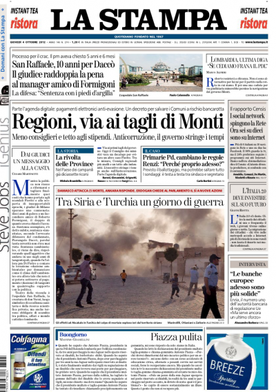 i giornali di oggi hanno in apertura notizie diverse: la Stampa, il Mattino e Avvenire si occupano delle misure per il taglio delle spese degli enti locali, che dovrebbero essere approvate oggi dal Consiglio dei ministri, la Repubblica e il Messaggero titolano sulla condanna a 10 anni per il faccendiere Daccò nel processo per il San Raffaele a Milano, il Giornale, Libero, il Manifesto e il Secolo XIX seguono l’arresto dell’amministratore delegato di Tributi Italia, che incassava le tasse per i Comuni senza però versargliele, il Corriere della Sera apre sulla tensione fra Siria e Turchia, con lo scambio di colpi di artiglieria fra i due paesi, mentre l’Unità, Europa e Pubblico si concentrano sulle polemiche all’interno del PD sulle regole per le primarie. I quotidiani sportivi aprono col successo del Milan a San Pietroburgo in Champions League.