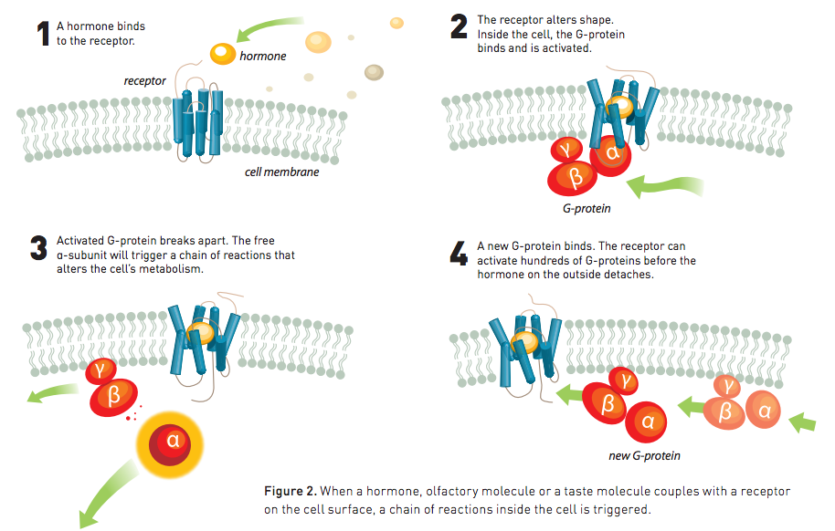 Oggi ci si riferisce a questa famiglia di recettori biologici con il nome di “recettori accoppiati alle proteine G”. Ci sono circa mille geni che possiedono le informazioni genetiche necessarie per creare questo tipo di recettori, che sono anche alla base di buona parte dei nostri sensi. Ci aiutano, infatti, a percepire la luce, gli odori, i profumi e a reagire a particolari stimoli, grazie alla loro capacità di avvertire il passaggio degli ormoni. Molti farmaci agiscono tramite questi recettori, ad esempio i betabloccanti (usati nelle malattie come ipertensione, angina e per patologie cardiache), gli antistaminici e diversi medicinali per le cure psichiatriche.