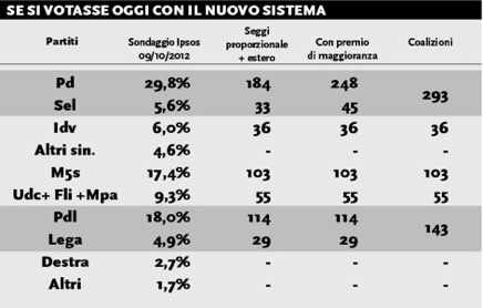 Il quotidiano Europa ha provato ad applicare la nuova legge alle percentuali di voto attribuite ai singoli partiti secondo il sondaggio Ipsos proposto durante la puntata di Ballarò di martedì scorso. E questo sarebbe il risultato se si votasse oggi: