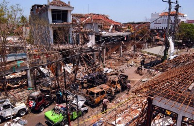 DENPASAR, BALI, INDONESIA – OCTOBER 16: A view of the bomb blast site on October 16, 2002 in Denpasar, Bali, Indonesia. The blast occurred in the popular tourist area of Kuta on October 12, leaving more than 180 people dead and 132 injured, with the death toll expected to rise. (Photo by Edy Purnomo/Getty Images)