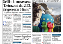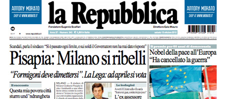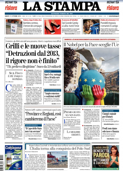 Le aperture dei giornali di oggi sono dedicate a notizie diverse: la Stampa, il Mattino, Libero e Avvenire si occupano delle polemiche sulla decisione del governo di fissare un tetto alle detrazioni che sarà applicato già dal 2013, sulle spese sostenute nell’anno in corso, il Corriere della Sera apre con il Nobel per la pace assegnato all’Unione Europea, l’Unità, il Manifesto, Pubblico e il Secolo d’Italia seguono le proteste di ieri degli studenti che portano carote contro il ministro Profumo, Repubblica rimane sulla crisi in Lombardia con la richiesta del sindaco di Milano Pisapia delle dimissioni di Formigoni. I quotidiani sportivi dedicano l’apertura alla vittoria dell’Italia in Armenia per le qualificazioni ai Mondiali del 2014.