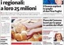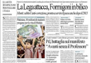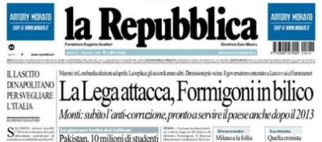 La notizia in prima pagina su tutti i giornali di oggi è «il colpo della Lega a Formigoni», cioè la richiesta – approvata ieri in una riunione del partito – di andare a votare in Lombardia il prossimo aprile, ben due anni prima della scadenza del mandato. È difficile decidere la seconda notizia più importante, dato che sui quotidiani di oggi c’è una certa varietà, ma molti dedicano spazio alle regole delle primarie e alla “Carta d’Intenti” dell’alleanza di centrosinistra, cercando di capire quali sono le implicazioni dietro le righe (un altro governo Monti è contemplato? quali sono le alleanze possibili?). Ed è interessante vedere come i quotidiani sportivi se la cavino, in mancanza del campionato di Serie A.