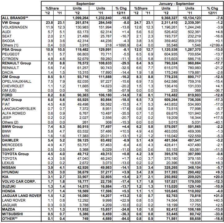 Tra le case automobilistiche europee se l’è cavata meglio della concorrenza il Gruppo Volkswagen con una riduzione pari all’8 per cento. Nei mesi scorsi la società era stata criticata da Sergio Marchionne, che oltre a essere amministratore delegato FIAT è anche presidente di ACEA, per la politica dei prezzi bassi adottata per mantenere alto il livello delle vendite. A luglio Marchionne disse che la società tedesca aveva “fatto un bagno di sangue sui prezzi e sui margini”.