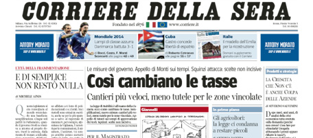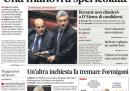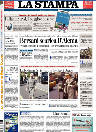 Per molti giornali di oggi l’apertura è dedicata alla presentazione alle camere della legge di stabilità e all’esame delle misure previste nella manovra. La Stampa, Pubblico, il Tempo, il Fatto e Europa si occupano ancora delle candidature del PD alle prossime politiche e delle parole di Bersani, che “scarica” D’Alema affidando al partito la scelta se proporgli o meno la candidatura, Repubblica e il Messaggero seguono la nuova inchiesta a Bergamo sulla regione Lombardia, mentre il Giornale riporta in primo piano il conto alla rovescia per Sallusti, dopo la decisione del parlamento di rimandare l’esame della legge che avrebbe dovuto evitargli il carcere. I quotidiani sportivi commentano la vittoria di ieri sera dell’Italia sulla Danimarca.
