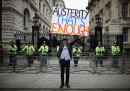 LONDON, UNITED KINGDOM – OCTOBER 20: A man holds up a banner reading ‘Austerity – That’s Enough’ outside outside Number 10 Downing Street during a TUC march in protest against the government’s austerity measures on October 20, 2012 in London, England. Thousands of people are taking part in the Trades Union Congress (TUC) organised anti-cuts march that ends with a rally in Hyde Park, where Labour leader Ed Miliband is scheduled to address the demonstrators. (Photo by Dan Kitwood/Getty Images)