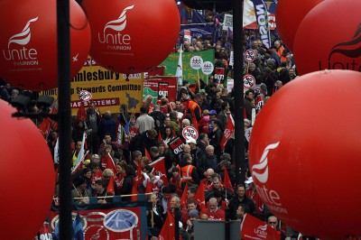 Più di 100 mila persone hanno manifestato oggi a Londra contro i tagli alla spesa decisi dal governo di David Cameron. Oltre ai giovani e ai disoccupati, hanno sfilato per le strade del centro vigili del fuoco, infermieri e insegnanti. Altre manifestazioni ci sono state in contemporanea anche a Belfast, in Irlanda, e a Glasgow, in Scozia. Si tratta della manifestazione più grande organizzata dall’inizio dell’anno in Gran Bretagna. La marcia si chiama A Future That Works ed è stata organizzata dalla principale sigla sindacale britannica, il Trades Union Congress (TUC).