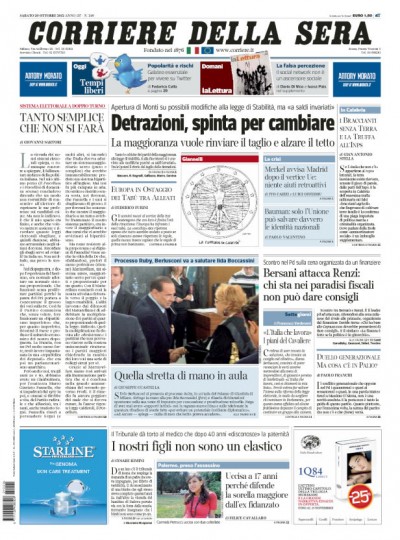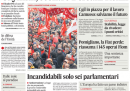 In mancanza di una grande notizia che metta d’accordo tutti, i quotidiani di questa mattina si occupano di temi piuttosto lontani e diversi, nella notizia di apertura. Ma qualche argomento ricorrente c’è: tra questi, Berlusconi che ieri è andato a Milano, a un’udienza del processo Ruby, e poi la lite a distanza tra Renzi e Bersani sulle isole Cayman e un episodio di cronaca nera avvenuto a Palermo, in cui è stata uccisa una ragazza di 17 anni. Oggi la Padania invita i manifestanti leghisti “Al gazebo!”, dato che iniziano le mobilitazioni su cui il partito ha investito molto nelle ultime settimane per il suo rilancio. I giornali sportivi parlano tutti della partita di Serie A tra Juventus e Napoli, che si giocherà stasera alle 18.