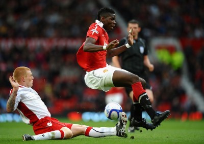 Nel Manchester United Pogba ha giocato soltanto tre partite, dicendosi spesso frustrato dal poco tempo di gioco concessogli dall’allenatore, Alex Ferguson: «Mi diceva che sarebbe venuto il mio momento ma poi non arrivava mai». Si è arrivati così al suo trasferimento in Italia, facilitato dal suo trovarsi in scadenza di contratto e dal suo avere un procuratore molto attivo sul mercato italiano, Mino Raiola, noto soprattutto per essere il procuratore di Mario Balotelli e Zlatan Ibrahimovic.