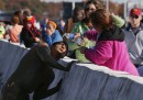 Circa 25 mila persone domenica hanno partecipato al Tough Mudder al Raceway Park di Englishtown, in New Jersey. Si tratta di una corsa a ostacoli particolarmente impegnativa lunga circa 15-20 chilometri: i concorrenti devono affrontare diverse prove sospesi sulle braccia, strisciando nel fango e sotto il filo spinato, correndo tra le fiamme o nell’acqua ghiacciata. Un portavoce dell’evento ha detto che solo l’80 per cento dei partecipanti riesce a finire il percorso, mettendoci in genere tre ore. Non c’è un limite di tempo, non c’è un vincitore – chi completa il percorso riceve una bandana arancione e un boccale di birra – e non ci sono particolari misure di sicurezza per garantire che nessuno si faccia male.