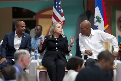 Secretary of State Hillary Rodham Clinton, center, speaks to Haiti’s President Michel Martelly, right, during the inauguration of the Caracol Haiti Industrial Park on the outskirts of Cap Hatien, Haiti, Monday, Oct. 22, 2012. Clinton encouraged foreigners to invest in Haiti as she and her husband Bill led a star-studded delegation gathered Monday to inaugurate the new industrial park at the center of U.S. efforts to help the country rebuild after the 2010 earthquake. At left, Haiti’s Prime Minister Laurent Lamothe. (AP Photo/Dieu Nalio Chery)