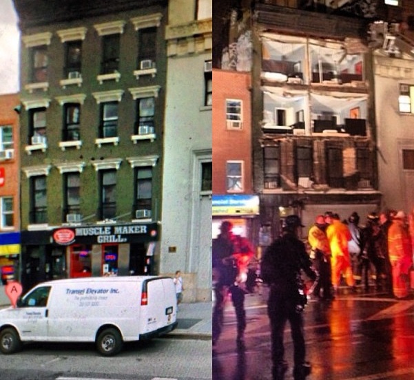 00.44. La facciata crollata a Manhattan, prima e dopo.