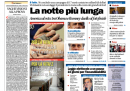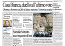 L’attesa per il voto di oggi per la presidenza degli Stati Uniti e l’incertezza sull’esito sono in apertura su quasi tutti i giornali, con l’eccezione di Libero e il Giornale, che titolano sulla contestazione a Fini durante il funerale di Pino Rauti, della Padania, che apre sulla decisione della Lega di andare da sola al voto in Lombardia, del Secolo XIX, che intervista Fini sull’incandidabilità dei condannati, e del Secolo d’Italia, che si occupa della polemica fra il ministro Fornero e i giornalisti.