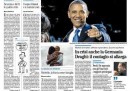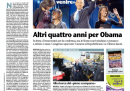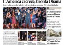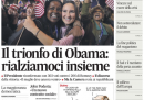 La vittoria di Barack Obama nelle elezioni presidenziali degli Stati Uniti è in apertura su tutti i giornali di oggi, che sottolineano anche la reazione negativa delle borse di ieri alla sua rielezione. I più entusiasti sono Pubblico, che titola “Adottateci”, e il Manifesto, che festeggia la vittoria del referendum sulla liberalizzazione dell’uso della marijuana col titolo “Yes we cannabis”. Il Giornale apre invece con le vicende giudiziarie del PD in Emilia, mentre Libero consiglia come risparmiare sulle spese per la casa. I quotidiani sportivi festeggiano il primo successo in Champions League della Juventus, che ha battuto 4-0 i danesi del Nordsjaelland.