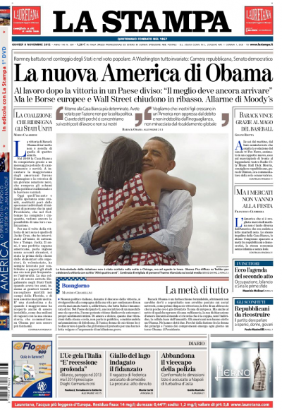 La vittoria di Barack Obama nelle elezioni presidenziali degli Stati Uniti è in apertura su tutti i giornali di oggi, che sottolineano anche la reazione negativa delle borse di ieri alla sua rielezione. I più entusiasti sono Pubblico, che titola “Adottateci”, e il Manifesto, che festeggia la vittoria del referendum sulla liberalizzazione dell’uso della marijuana col titolo “Yes we cannabis”. Il Giornale apre invece con le vicende giudiziarie del PD in Emilia, mentre Libero consiglia come risparmiare sulle spese per la casa. I quotidiani sportivi festeggiano il primo successo in Champions League della Juventus, che ha battuto 4-0 i danesi del Nordsjaelland.