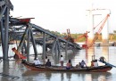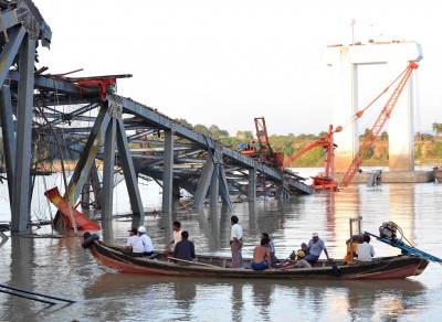 People on a boat work near a damaged bridge in Kyauk Myaung township, east of Shwebo, following a powerful earthquake that hit Myanmar killing at least 13 people, injured dozens and sparking panic in the major central city of Mandalay on November 11, 2012. The shallow 6.8-magnitude quake struck in a rural area 116 kilometres (72 miles) north of Mandalay followed by a series of aftershocks, the US Geological Survey (USGS) said. AFP PHOTO / Soe Than WIN (Photo credit should read Soe Than WIN/AFP/Getty Images)