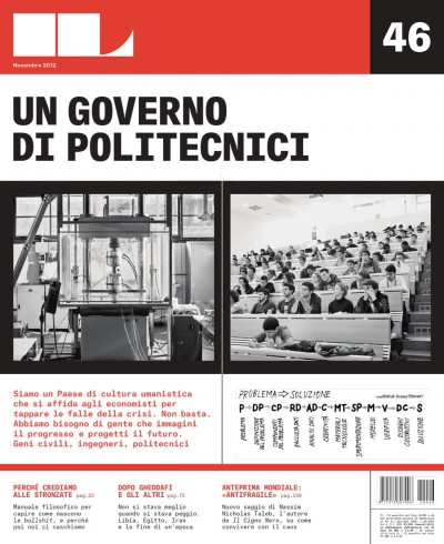 – La copertina, come avete visto, è dedicata al Governo dei Politecnici. Gli articoli sono di Daniele Bellasio, Guido De Franceschi e Francesco Pacifico, con una breve introduzione del titolare. L’idea è: siamo un paese di cultura umanistica che quando è in difficoltà si affida agli economisti, tecnici difensivi, perché quindi non pensarci prima e riscoprire ingegneri, architetti e designer che immaginano il futuro e progettano il cambiamento?