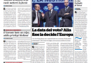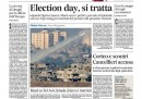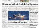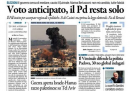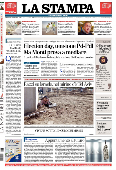 Non c’è una notizia unica in apertura sui giornali di oggi: molti aprono con le polemiche fra i partiti sulla data del voto e sull’accorpamento nella stessa data di elezioni regionali e politiche, Avvenire, Manifesto e il Secolo XIX si occupano invece della tensione fra Israele e Palestina dopo gli attacchi nella striscia di Gaza e i razzi lanciati ieri da Hamas verso Tel Aviv, Repubblica e il Giornale seguono ancora gli scontri durante le manifestazioni di mercoledì, concentrandosi il primo sulle violenze della polizia in un’intervista al ministro dell’interno Cancellieri e il secondo sulle violenze dei manifestanti. Sui quotidiani sportivi tiene banco la polemica fra Cassano e Conte, con accuse reciproche di bassa moralità.