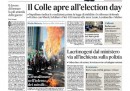 L’incontro al Quirinale fra i Presidenti della Repubblica Napolitano, del Consiglio Monti, di Camera e Senato Fini e Schifani, che ha portato all’indicazione della data del 10 marzo come possibile per l’election day, con l’accorpamento di elezioni politiche e regionali, è la notizia di apertura su quasi tutti i giornali di oggi. Il Corriere della Sera e Avvenire si occupano invece dei missili lanciati da Hamas verso la città di Gerusalemme, mentre il Manifesto e Pubblico rimangono ancora sugli scontri durante le manifestazioni di mercoledì, con il filmato che mostra il lancio di lacrimogeni dall’interno del ministero di giustizia. I quotidiani sportivi aprono con la visita di Berlusconi a Milanello, per rilanciare la stagione del Milan.