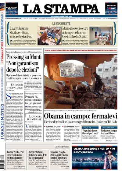Per la maggior parte dei giornali di oggi l’apertura è dedicata agli attacchi di Israele e alla risposta di Hamas con il lancio di missili, e il titolo più diffuso è sulla “strage di bambini” a Gaza. La Stampa, il Mattino e il Secolo XIX titolano invece sulle parole di Monti, che rivolto agli investitori in Kuwait ha detto di non garantire sull’affidabilità dell’Italia dopo le elezioni. I quotidiani sportivi aprono su nuove polemiche fra Inter e Juventus sugli arbitri, dopo le proteste interiste per un rigore negato ieri, e sul campionato di formula 1 ancora incerto a un solo gran premio dalla conclusione.
