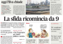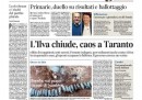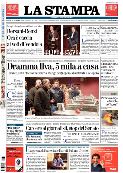 Le notizie che si dividono l’apertura dei giornali di oggi sono due: la chiusura dell’Ilva di Taranto, decisa dopo gli arresti ordinati dalla magistratura per i vertici dell’azienda, e la sfida fra Bersani e Renzi al ballottaggio per le primarie del centrosinistra. Il Giornale titola invece sulla decisione della procura di Milano per gli arresti domiciliari del direttore Sallusti, dopo la condanna per diffamazione, e il Manifesto lancia l’ennesimo appello per la sopravvivenza del giornale. I quotidiani sportivi aprono con la vittoria del Napoli, che si avvicina alla Juventus in testa alla classifica, e la sconfitta dell’Inter, che invece perde l’occasione, nei posticipi giocati ieri sera.