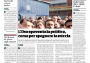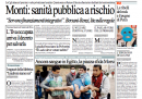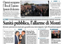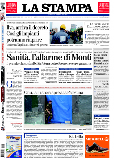 Per molti giornali di oggi l’apertura è dedicata alle notizie sull’Ilva di Taranto, occupata ieri dagli operai dopo la decisione dell’azienda di chiudere lo stabilimento, e all’incontro fra Monti e Napolitano per discutere del decreto del governo per garantire la continuazione dell’attività della fabbrica. Repubblica, il Corriere della Sera, il Messaggero, il Tempo e Pubblico si occupano invece dei timori per la sanità italiana del presidente del consiglio Monti, che ha dichiarato che per riuscire a mantenerla c’è bisogno di finanziamenti integrativi rispetto a quelli pubblici, mentre il Giornale segue ancora la vicenda Sallusti e Libero prevede nuove tasse in arrivo.