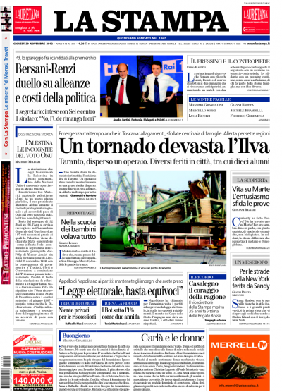 Sono due le notizie che si dividono le aperture dei giornali di oggi: la tromba d’aria che ha colpito l’area dell’Ilva di Taranto, provocando danni, feriti e un disperso, e il confronto televisivo di ieri sera fra i due candidati al ballottaggio per le primarie del centrosinistra Bersani e Renzi. Il Giornale annuncia invece la decisione del PDL di cancellare le primarie previste per il 16 dicembre, mentre Libero prosegue la sua campagna contro il fisco. I quotidiani sportivi si occupano di Sneijder e dell’Inter, accusata di mobbing nei confronti del calciatore olandese.