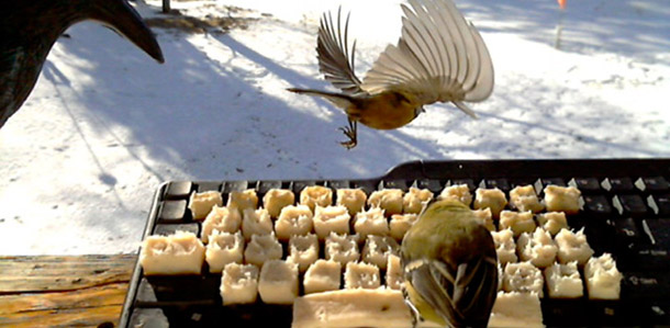 L’artista lettone Voldemars Dudums ha realizzato un sistema per fare inviare i messaggi su Twitter direttamente agli uccelli, che sono poi gli animali cui è ispirato il social network (“tweet”, se fosse ancora necessario dirlo, vuol dire “cip”, “cinguettio”). Dudums ha sostituito i tasti di una tastiera di un vecchio computer con una serie di cubetti di pancetta e l’ha lasciata all’aperto. Gli uccelli arrivano, colpiscono con il becco i tasti per strappare pezzi di grasso e di conseguenza compongono il tweet. Il progetto va avanti da più di un anno, ha un sito web ed è stato di recente ripreso da This Is Colossal.