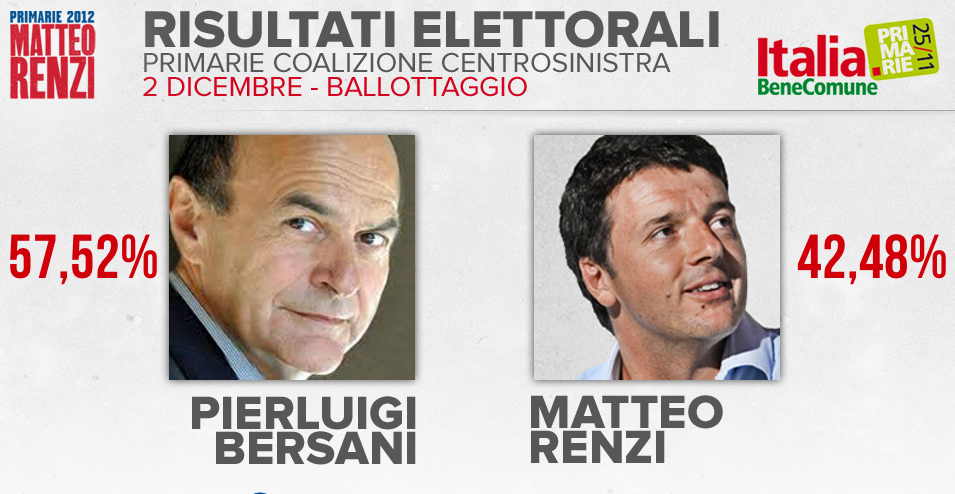 Pier Luigi Bersani ha vinto il ballottaggio delle primarie del centrosinistra e sarà quindi il candidato della coalizione a presidente del Consiglio. Il segretario del PD ha ottenuto il 61,1 per cento dei voti, mentre il suo sfidante, Matteo Renzi, ha ottenuto il 38,9: i dati ufficiali saranno diffusi lunedì. Hanno votato 2,5 milioni di persone, circa il venti per cento in meno rispetto al primo turno.
