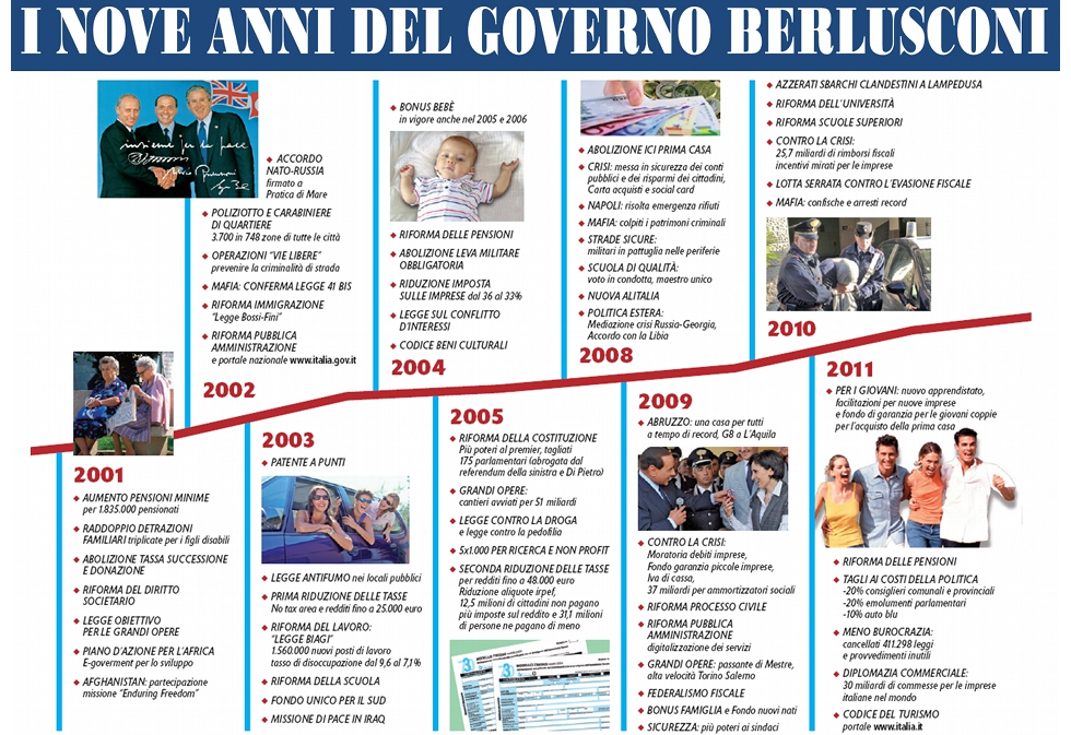 13.00 – Sull’homepage del sito del Popolo della Libertà, da questa mattina, c’è un grafico che rivendica tutti i risultati degli ultimi due governi guidati da Silvio Berlusconi.