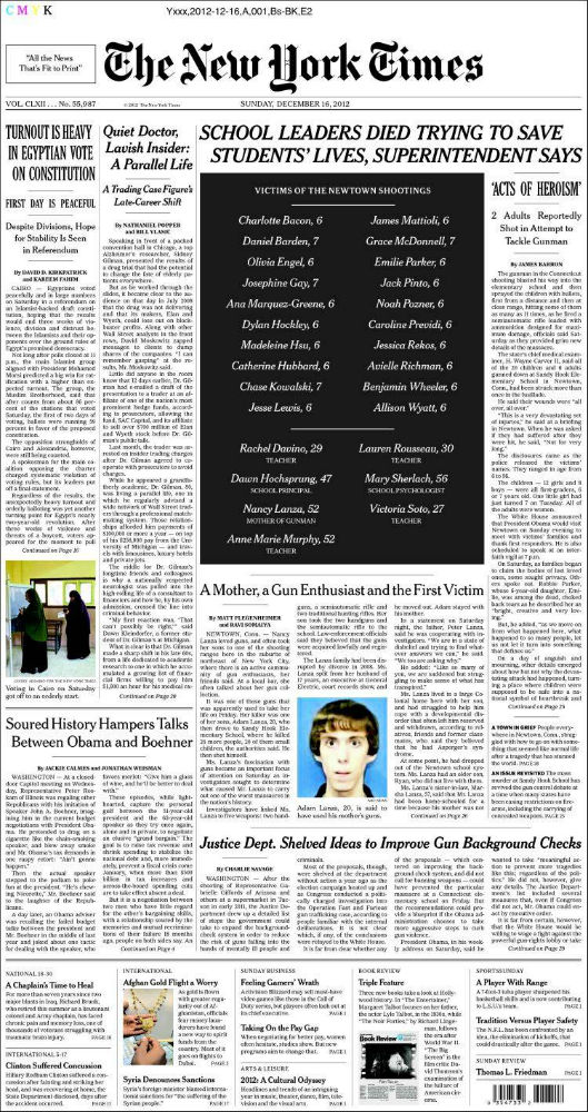 Oggi il New York Times ha pubblicato in prima pagina, all’interno di un riquadro nero, la lista di tutte le 27 persone che venerdì sono state uccise da Adam Lanza durante la strage di Newtown.