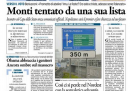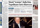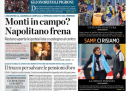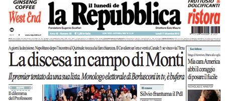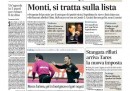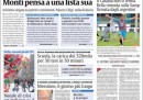 Quasi tutti i quotidiani di oggi aprono con la candidatura di Monti alle prossime elezioni, sulla quale ancora non c’è chiarezza: dopo l’incontro con il Presidente della Repubblica Napolitano l’ipotesi più accreditata dai giornali è quella di una lista che lo sostenga, senza una sua candidatura diretta, ma Monti mantiene ancora il mistero sul suo futuro. Il Giornale titola invece sulla lunga intervista di Berlusconi a Canale 5, nella quale l’ex premier ha promesso che abolirà l’IMU. I quotidiani sportivi commentano i risultati della domenica calcistica, che danno alla Juventus il titolo di campione d’inverno con due giornate di anticipo.
