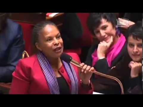 Durante la seduta per le interrogazioni al governo il deputato Bernard Perrut dell’UMP, il partito di destra all’opposizione, ha chiesto al primo ministro Jean-Marc Ayrault se il governo avesse intenzione «con il pretesto della modernità, di distruggere il matrimonio», di «legalizzare la maternità surrogata» e di «far scomparire in tutti i testi le parole papà e mamma»· Taubira – che è nata a Caienna, nella Guyana francese e ha 60 anni – ha risposto a Perrut ricordandogli che il progetto di legge non prevede di cancellare le parole padre e madre dal codice civile. E ha poi continuato dicendo: