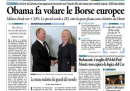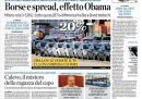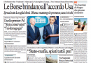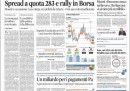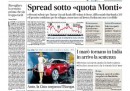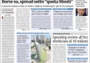 Per la maggior parte dei giornali di oggi l’apertura è dedicata alla giornata positiva nelle borse dopo l’accordo raggiunto negli Stati Uniti sul fiscal cliff, con lo spread sceso sotto la “quota Monti”, la soglia fissata dal presidente del consiglio come obiettivo per l’azione del suo governo. L’Unità invece attacca Monti per le sue parole sulla riduzione delle tasse, il Giornale pubblica un sondaggio che darebbe il premier a un dato molto inferiore alle aspettative, Avvenire titola sulla Siria, con i dati delle vittime di venti mesi di guerra civile, mentre il Manifesto apre con il riconoscimento in un ospedale di Padova del figlio di una coppia lesbica.