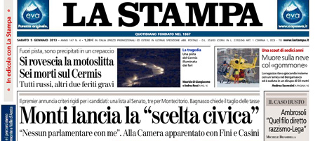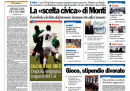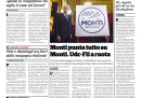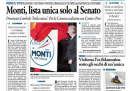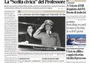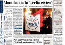 I quotidiani di oggi aprono tutti con la presentazione del simbolo della lista Monti per le prossime elezioni, “Scelta civica”, che si presenterà come lista unica al Senato mentre alla Camera sarà accompagnata dalle liste di UDC e FLI. Le uniche eccezioni sono il Manifesto, che titola sulla chiusura degli ultimi Virgin Megastore francesi, e Libero, che prosegue la sua campagna contro le tasse e la politica fiscale del governo e dell’agenzia delle entrate.