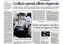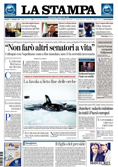 Non c’è una notizia unica in apertura sui giornali di oggi: molti aprono con la partecipazione di Berlusconi alla trasmissione di Santoro, che Libero e il Giornale commentano molto positivamente per il leader del PDL. La Stampa invece intervista il Presidente della Repubblica Napolitano, che dice di non voler nominare altri senatori a vita prima della fine del suo mandato, Repubblica titola su Bersani che esclude che Monti possa essere il prossimo candidato al Quirinale, l’Unità e il Manifesto si occupano delle parole del presidente dell’Eurogruppo Juncker, che cita Marx e propone il salario minimo in tutti i paesi europei, mentre i temi economici sono in apertura sul Messaggero, con lo spread ancora in calo, e Avvenire, con le parole del Presidente della Commissione Europea Barroso, ottimista sulla fine della crisi.