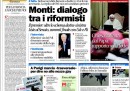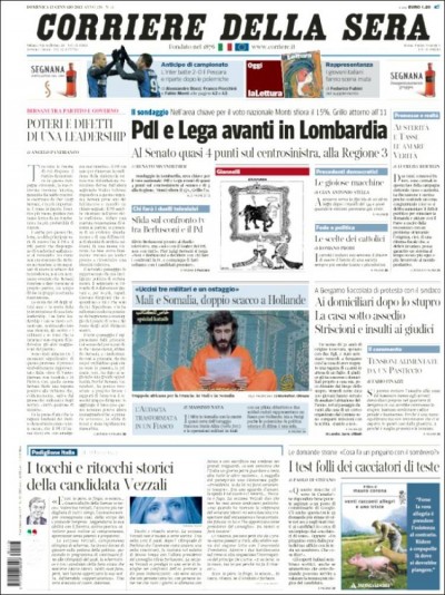 Oggi le prime pagine sono dedicate a temi diversi, ma tutti che ruotano intorno alla politica: il Corriere apre con un sondaggio secondo cui l’alleanza PdL-Lega Nord ha un buon risultato in Lombardia, mentre Repubblica preferisce l'”appello” di Monti alla collaborazione tra i “riformisti”, dopo il voto. Una notizia che ritorna su diverse prime pagine è il rifiuto di Bersani a partecipare a un confronto televisivo con Silvio Berlusconi, presentata con titoli che vanno da “Bersani sfida Berlusconi” (l’Unità) a “Bersani scappa” (Libero). La politica internazionale, dopo l’intervento francese in Mali, è più presente del solito tra i titoli di oggi, mentre i quotidiani sportivi si occupano soprattutto della vittoria di ieri dell’Inter contro il Pescara.