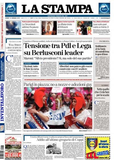 I giornali di oggi dedicano l’apertura a notizie diverse, ma quasi tutti si occupano comunque di politica italiana: la Stampa e l’Unità aprono con la tensione fra Lega e PdL sull’indicazione sul simbolo del PdL di Berlusconi come leader dell’alleanza, Repubblica titola invece sulle parole di Casini e Bersani su chi sarà il Presidente del Consiglio nominato, il Messaggero e il Mattino si occupano della presenza di indagati nelle liste del PdL, e il Giornale apre sulle dichiarazioni polemiche di Albertini su Formigoni. Il Corriere della Sera e il Secolo XIX aprono invece sulle manifestazioni in Francia contro i matrimoni omosessuali, mentre i giornali sportivi titolano sul pareggio della Juventus e le vittorie di Lazio e Napoli che si avvicinano alla testa della classifica.