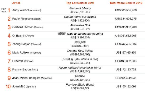 Al primo posto della classifica c’è Andy Warhol, le cui opere sono state vendute nel 2012 per un totale di oltre 380 milioni di dollari, e che ha battuto Pablo Picasso, fino allo scorso anno il più venduto, al secondo posto con un totale di oltre 334 milioni di dollari. Al terzo posto c’è il pittore tedesco Gerard Richter, con quasi 300 milioni di dollari. La classifica riflette il dominio delle opere d’arte occidentali dal dopoguerra in poi, anche se in classifica compaiono tre artisti cinesi. La maggior parte dei quadri in classifica è stata venduta durante le aste delle due più grandi case d’aste del mondo, Sotheby’s e Christie’s.