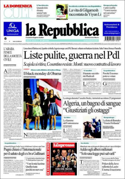 Tra i titoli principali dei giornali di oggi ci sono i problemi del PdL con la formazione delle liste dei candidati alle prossime politiche e in particolare il caso di Nicola Cosentino, che probabilmente sarà ricandidato in Campania nonostante i processi in corso a suo carico. Molti quotidiani mettono in prima pagina la fine della crisi degli ostaggi in Algeria, che è finita male: nei giorni del sequestro sono morti 23 ostaggi e 32 sequestratori. La Stampa, invece, mette sopra la testata un ampio riquadro per ricordare L’avvocato Agnelli dieci anni dopo: Gianni Agnelli morì il 24 gennaio 2003. Sui giornali sportivi, tutti i titoli sono per il centrocampista francese della Juventus Paul Pogba, che ieri ha fatto due gol nella partita contro l’Udinese (finita 4-0).
