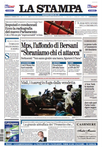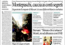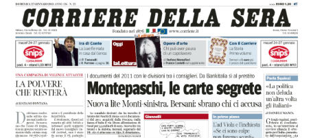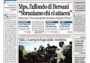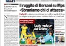 Oggi i giornali si occupano ancora della vicenda del Monte dei Paschi (che abbiamo spiegato nei suoi punti principali qui): in particolare, il Corriere e Repubblica dedicano il loro titolo principale ai “conti segreti” e alle “carte segrete” che potrebbero contenere altri sviluppi dell’indagine. Altri quotidiani invece preferiscono dedicare il titolo di prima pagina a una dichiarazione di Pier Luigi Bersani, che ha promesso di “sbranare” chi avrebbe attaccato il Partito Democratico sulla vicenda. I quotidiani sportivi, invece, si dedicano a un grande tema classico del genere: i torti e i favori arbitrali, dopo l’anticipo di campionato di ieri tra Juventus e Genoa finito 1-1.