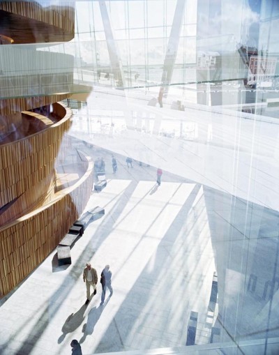 L’edificio assomiglia a un grande ghiacciaio e di notte dalle enormi vetrate dell’Opera escono dei fasci di luce che si riflettono sulle acque del fiordo. Il tetto dell’edificio si è trasformato presto in un’ampia piazza pubblica molto frequentata, realizzando quello che voleva essere uno dei caratteri peculiari del progetto: far sì che l’edificio producesse un forte risultato civico ancora prima che estetico. L’inclinazione del tetto e l’apparente mancanza di barriere protettive lungo il suo perimetro hanno creato quello che Owen definisce un effetto esilarante: guardando verso l’alto si ha l’impressione di essere in montagna, con le sagome degli altri visitatori che hanno alle spalle solo il colore del cielo; guardando invece verso il basso sembra che il tetto si immerga nelle acque del fiordo.