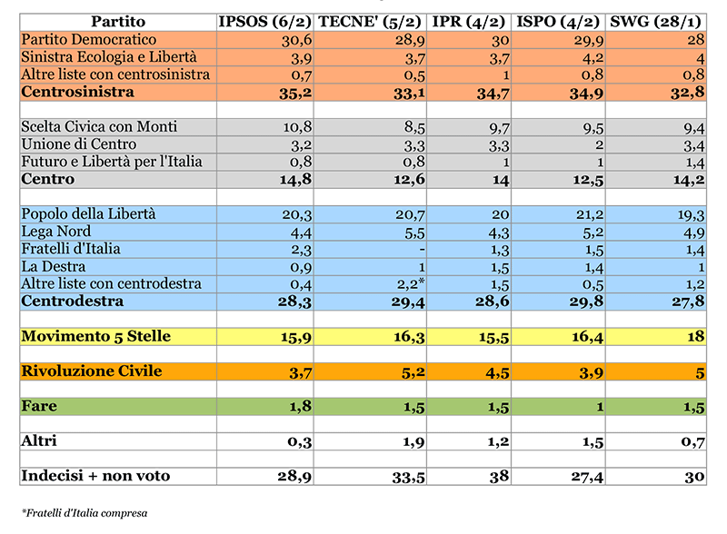 Il centrosinistra è dato in vantaggio rispetto al centrodestra di almeno 5 punti percentuali. Il centro di Monti è dato al di sopra del 12 per cento, poco al di sotto del Movimento 5 Stelle di Beppe Grillo. Rischia, invece, di non superare lo sbarramento del 4 percento previsto dalla legge elettorale Giannino con il suo Fare, mentre Rivoluzione Civile di Ingroia è dato di poco sopra il limite. La legge elettorale tende a favorire i partiti che si presentano in coalizione, con uno sbarramento più basso, al 2 per cento, e la possibilità di “ripescare” il migliore partito tra quelli che in coalizione sono rimasti sotto al 2 per cento.