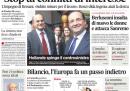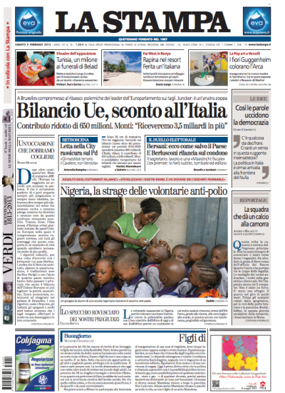 Non c’è una notizia unica in apertura sui giornali di oggi: la maggior parte titola sull’accordo raggiunto dall’Unione Europea sul bilancio comunitario fino al 2020, considerato quasi unanimemente un accordo al ribasso, mentre i temi della campagna elettorale trovano molto spazio, con l’annuncio di Berlusconi di un condono tombale e una sanatoria edilizia, le sue critiche al festival di Sanremo, la promessa di Bersani di una legge sul conflitto di interessi e l’attacco di Renzi a Ingroia. I quotidiani sportivi presentano gli anticipi di campionato di oggi che vedono in campo le due squadre in testa alla classifica, Juventus e Napoli.
