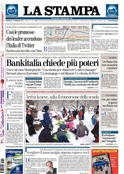 La proposta da parte di alcuni esponenti della lista Scelta Civica – quella che ha come candidato premier Mario Monti – di spostare il loro appoggio alla regione Lombardia dal candidato Gabriele Albertini (ex sindaco di Milano col centrodestra) al candidato Umberto Ambrosoli, appoggiato dal centrosinistra, ha agitato ieri la campagna elettorale e occupa molto spazio sulle prime pagine. Poi c’è il freddo americano di ieri e quello italiano in arrivo, e i risultati degli anticipi della serie A di ieri.