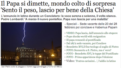 Sta spopolando la foto di un fulmine che colpisce San Pietro, presentata per esempio qui su Repubblica e attribuita al fotografo ANSA Alessandro Di Meo. Secondo la didascalia, lo scatto è stato realizzato proprio oggi, nella giornata dell’annuncio delle dimissioni del Papa, e quindi ha un valore simbolico davvero notevole.