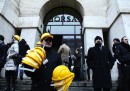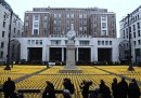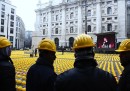 Le foto dei novemila caschi gialli posizionati davanti alla Borsa a Piazza Affari