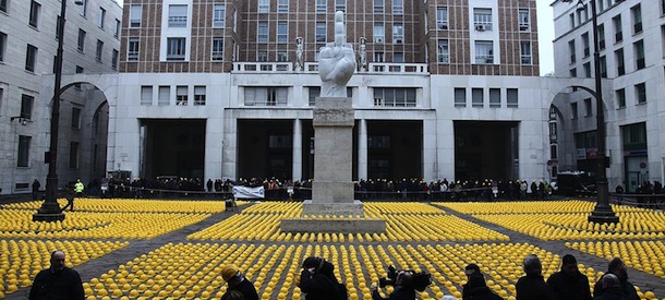 Circa novemila caschi gialli, quelli utilizzati dagli operai nei cantieri, sono stati posizionati davanti alla sede della Borsa in Piazza Affari a Milano, per protestare contro la crisi del settore edilizio. Alla manifestazione hanno partecipato venti associazioni di categoria lombarde: denunciano un calo di investimenti pari al 7,6 per cento nel 2012, che secondo le previsioni calerà ancora nel 2013. Secondo le associazioni negli ultimi cinque anni circa 360 mila persone che lavoravano nel settore hanno perso il lavoro, di cui almeno un decimo in Lombardia. Il numero sale a 550 mila se si considerano anche i settori collegati. Oltre a operai e sindacati erano presenti alla protesta architetti, impiegati, agenti immobiliari e artigiani.